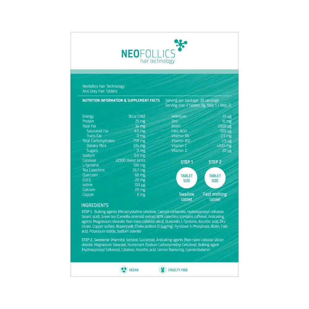 獨有兩種方式協同發揮作用,以改善和刺激頭髮色素沉著-1)食用黑色素複合吞嚥片,刺激黑色素合成並增加頭髮色素沉著;2)使用過氧化氫酶快速溶片劑,有效抑制引發白髮的過氧化氫 。透過男性和女性小組的研究證明75%的客戶發現180 天內白髮顯著減少。
